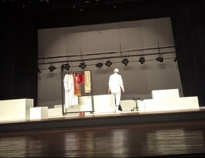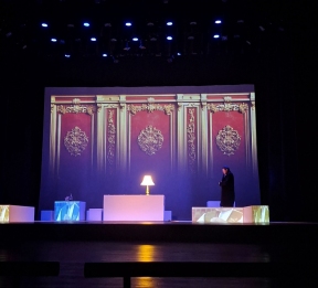 O cenário conta com projeção de imagens e praticáveis que se transforma em diversas ambientações e têm variadas funções cênicas.