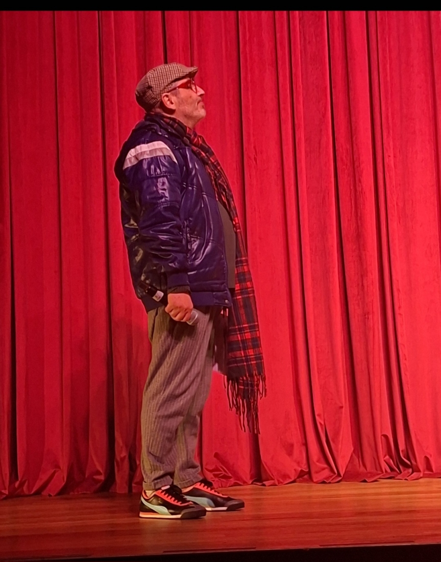 as suas criações sào importantes para o teatro. Ele lê um manifesto do autor da peça Renan Queiroz e ao fundo, um vídeo do mestre Zé, ao piano, ilumina o palco.