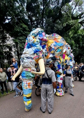 Num cortejo pelo parque, contam histórias de vida mudadas pelo elefante.