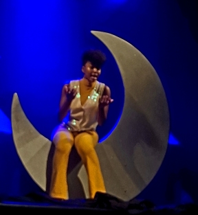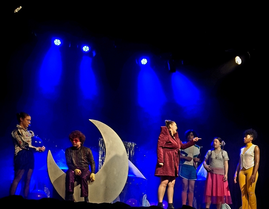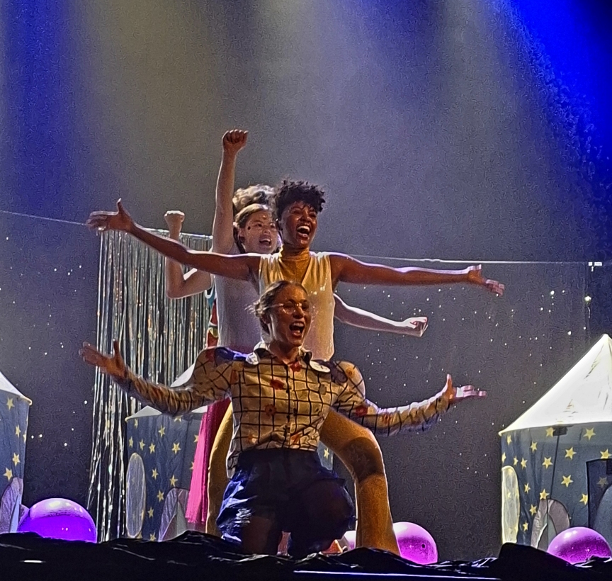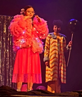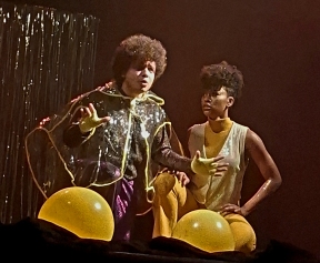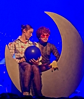 No palco, figurinos coloridos, às vezes psicodélicos, e elementos que remetem à infância, como bolas, e que ajudam os atores a encenar a história de forma lúdica e dinâmica.