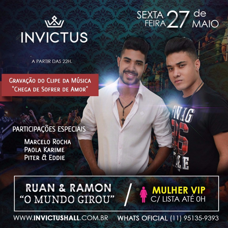 Shows: O show da dupla acontece na casa de shows Invictus hall e na ocasião os artistas irão gravar o clipe “Chega de sofrer de amor”.