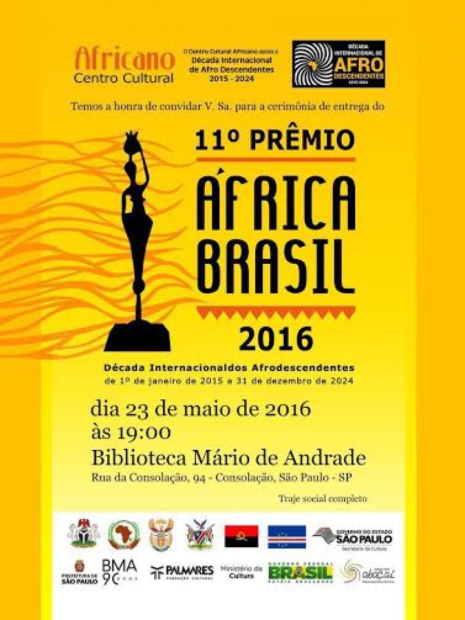 A cerimônia de premiação será no próximo dia 23, às 19h00, na Biblioteca Mário de Andrade, e lembra o Dia da Luta pela Independência da África e a Década Internacional de AFRO Descendente (25 de maio).