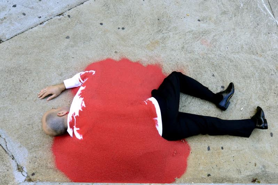 Performer Alexandre D’Angeli usa 350 quilos de areia vermelha para cobrir seu corpo estático durante duas horas