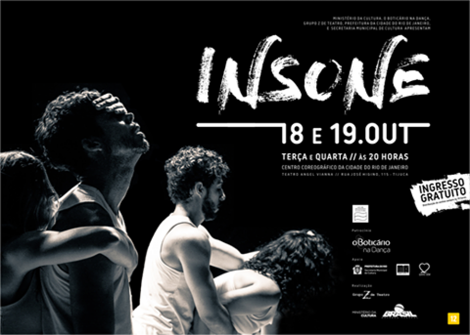 Espetáculo de dança do Grupo Z de Teatro Apresentações: 18 e 19 de outubro (terça e quarta-feira), às 20h Teatro Municipal Angel Vianna - Centro Coreográfico da Cidade do Rio de Janeiro Rua José Higino 115, Tijuca. Tel.: (21) 3238 0601 / 3238 0357 Entrada franca – distribuição de senhas a partir das 19h Classificação etária: 12 anos. Duração: 45 min. FICHA TÉCNICA – “INSONE” Direção: Carla van den Bergen e Fernando Marques Coreografia: Carla van den Bergen Dramaturgia: Fernando Marques Elenco: Alexsandra Bertoli, Daniel Boone, Ivna Messina, Luciano Rios Produção: Grupo Z de Teatro Figurino: Francina Flores Cenário: Grupo Z de Teatro Iluminação: Carla van den Bergen INFORMAÇÕES PARA A IMPRENSA Catharina Rocha :: Máquina de Escrever Comunicação +55 (21) 9-9205 8856 | 2587 2402 catharinarocha@hotmail.com |catharocha@gmail.com |