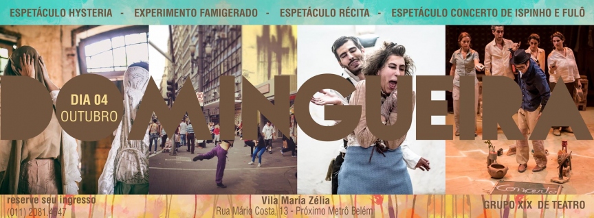Domingueira 19, do Grupo XIX. R. Mário Costa, 13 (Entre as ruas Cachoeira e dos Prazeres) . Vila Maria Zélia – Leste. São Paulo. Dom 04/10 das 13:30 às 19:30.