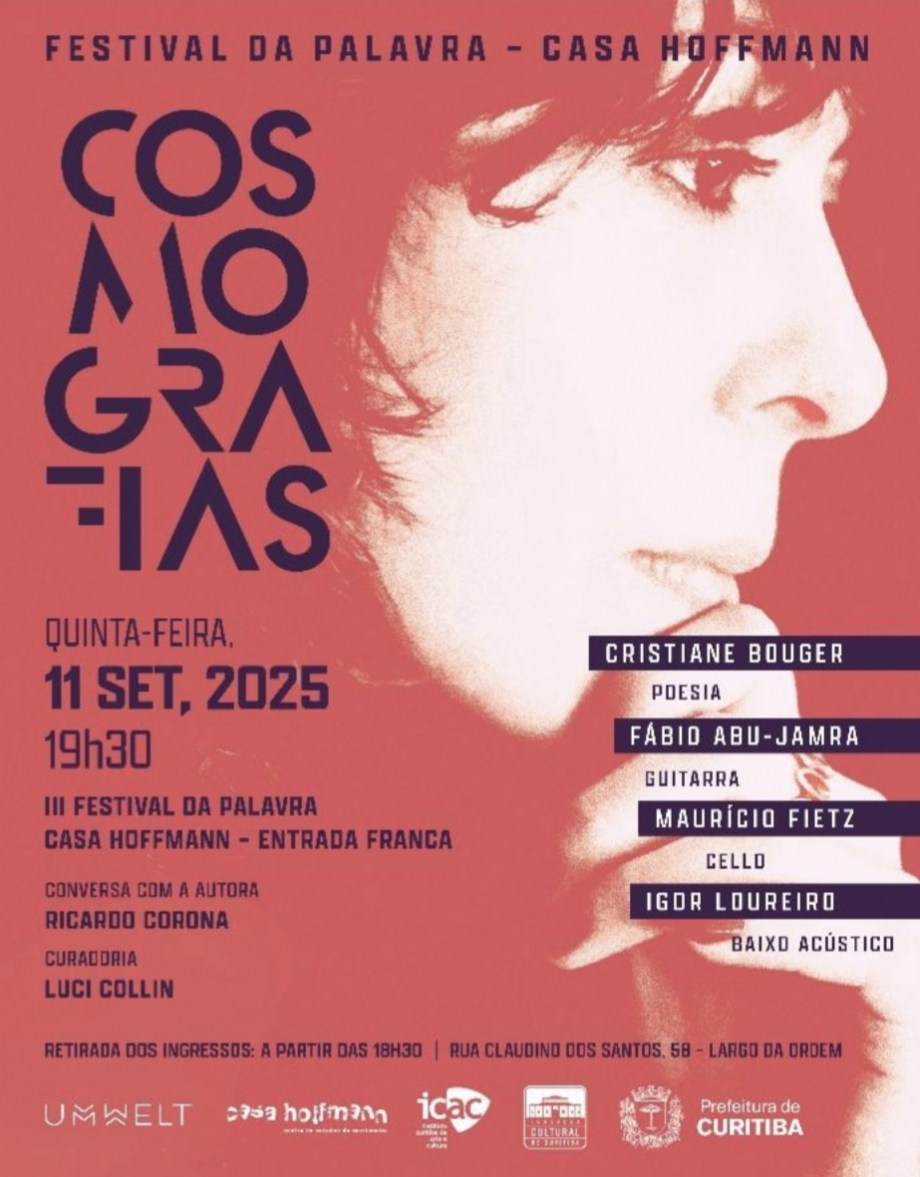 Turismo e eventos culturais: Curitiba - Recital “Cosmografias”, da artista interdisciplinar e escritora Cristiane Bouger, ocorre dia 11 de setembro na Casa Hoffmann