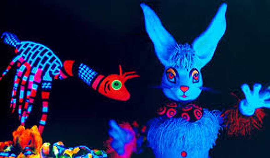 A montagem mistura luz negra, música e teatro de bonecos e transforma o teatro numa festa.