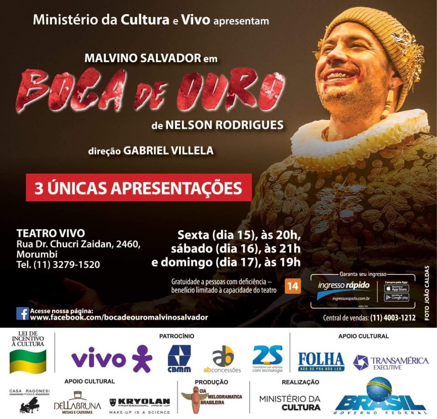 O #FestivalTeatroVivo, idealizado pelo André Acioli, faz com que Boca de Ouro feche com chave (de ouro) a sua trajetória que ganhou o merecido apreço do público e da crítica.