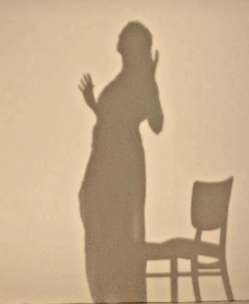Uma caixa branca, com duas cadeiras e alguns vídeos de pessoas que complementam o que está sendo dito no palco.