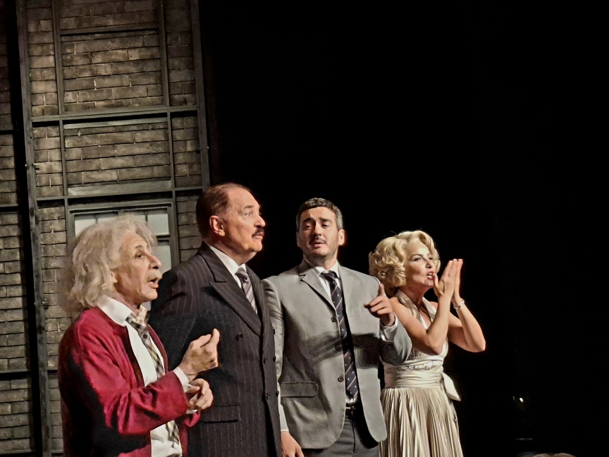 Como é bom ver em cena atores tão experientes talentosos. Cada um deles com uma desenvoltura peculiar e interpretações bem construídas. Amanda Acosta e Cássio Scapin desenham com maestria os espíritos perspicazes da atriz Marilyn Monroe (Amanda Acosta) e do cientista Einstein (Cássio Cassio Scapin ). Em nenhum momento apresentam caricaturas de figuras tão conhecidas e que na maioria das vezes são muito estereotipadas no teatro, cinema e TV. Marilyn, vale dizer, é sedutora, mas com uma inteligência pouco explorada pelos dramaturgos.