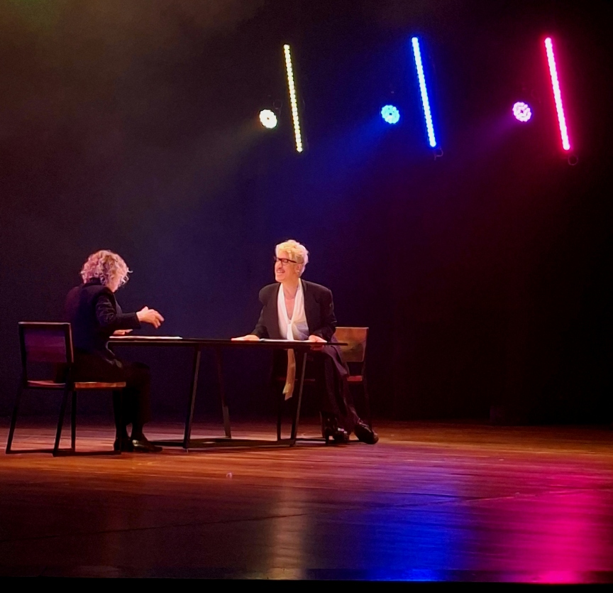 Teatro cheio e público emocionado por conferir esse encontro tão especial. Marília - atriz, jornalista, entrevistadora, cantora, mãe. Theodoro - ator, figurinista, cenógrafo, filho.
