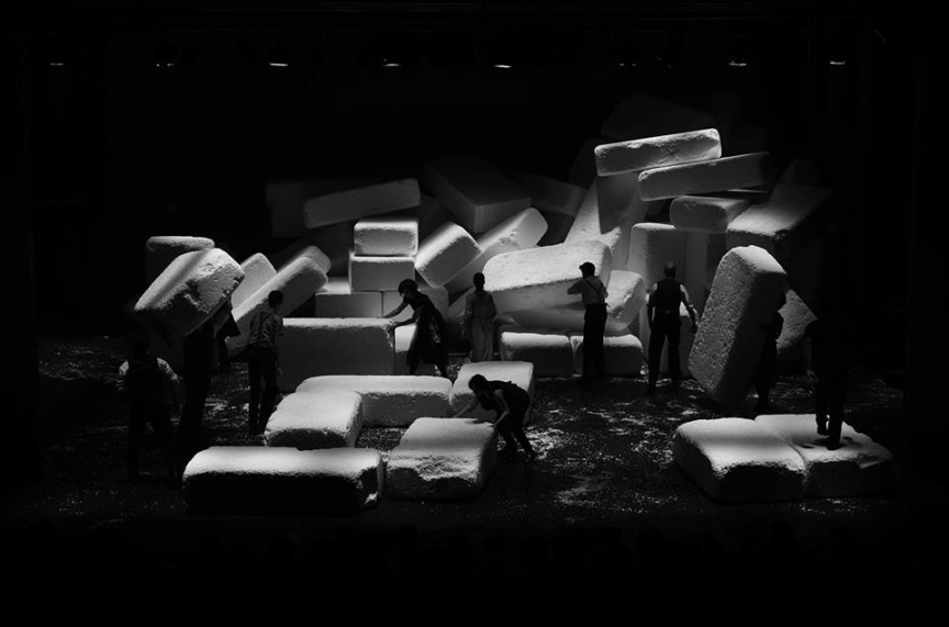 No palco, vários blocos de isopor são manipulados pelos atores, como num quebra-cabeça de emoções, sensações e gritos, ou como uma América Latina que pulsa, com momentos de desenvolvimento e também com sérias crises políticas e econômicas.