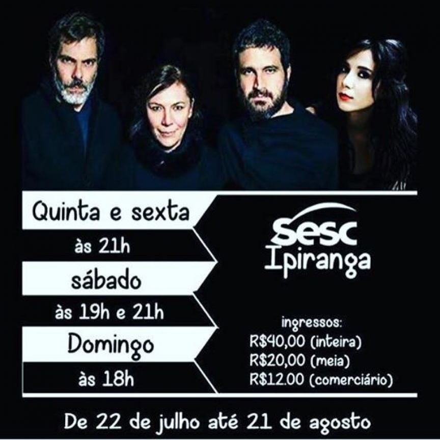 Bilheteria Sesc Ipiranga - Terça a sexta das 12h às 21h, sábado das 10h às 21h30 e domingo e feriado das 10h às 18h (ingressos à venda em todas as unidades do Sesc).