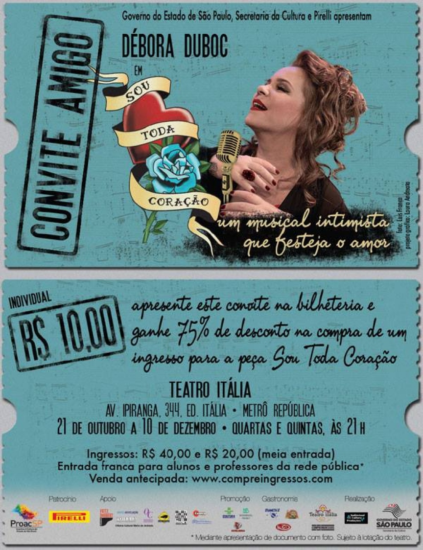 Débora Duboc é uma atriz talentosa e carismática, que tem uma voz potente e muito bonita. Passeia com louvor por um repertório que traz desde canções consagradas pela riqueza das letras e músicas (Sem Açúcar, Gota d’água (Chico Buarque), Meus Tempos De Criança (Ataulfo Alves), O Sole Mio (Giovanni Capurro e Eduardo Di Capua), Coração Vagabundo (Caetano Veloso), Bandeira Branca (Max Nunes e Laércio Alves), Samba e Amor (Chico Buarque), mas sem deixar de lado, por exemplo, o clássico brega Eu Não Sou Cachorro Não (Waldick Soriano), Vingativa (Wagner Ribeiro de Souza) e Canalha (Walter Franco), com um