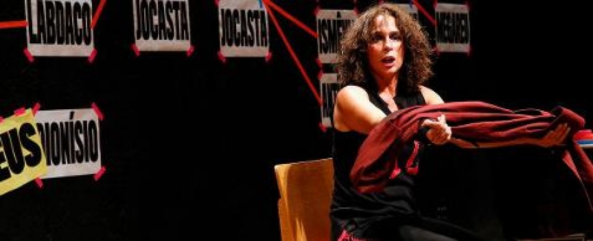 Em cena, a atriz Andrea Beltrão, que assina a concepção dramatúrgica com Haddad, vive a personagem Antígona, filha de Édipo e Jocasta, que foi condenada por fazer de tudo para que seu irmão Polinice fosse enterrado ( mesmo contra a vontade de seu tio Creonte, rei da cidade de Tebas).