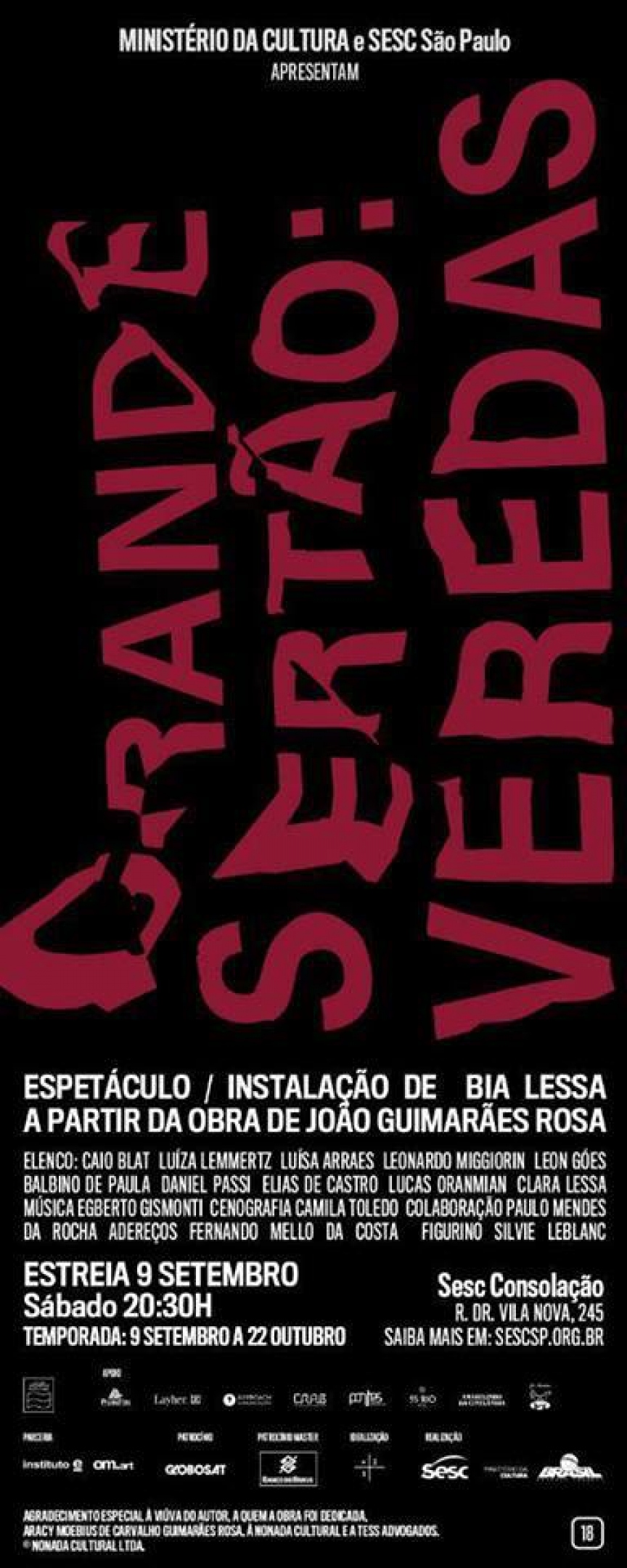 Na adaptação do livro para o teatro, Bia utiliza a linguagem popular e regional da obra, que retrata o modo de falar do sertão mineiro e traz também uma prosódia própria, criada pelo autor. Assina uma adaptação de qualidade, de fácil entendimento, e consegue colocar em cena a essência da trama (Duração: 160 minutos).