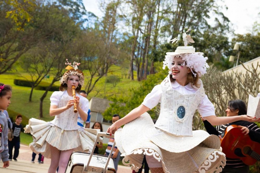 Nesse espetáculo para crianças e adultos, duas artistas estão vestidas de figurinos que lembram ilustrações de livros e passeiam por ruas e praças para contar pequenas histórias que duram entre 3 e 5 minutos cada uma delas.