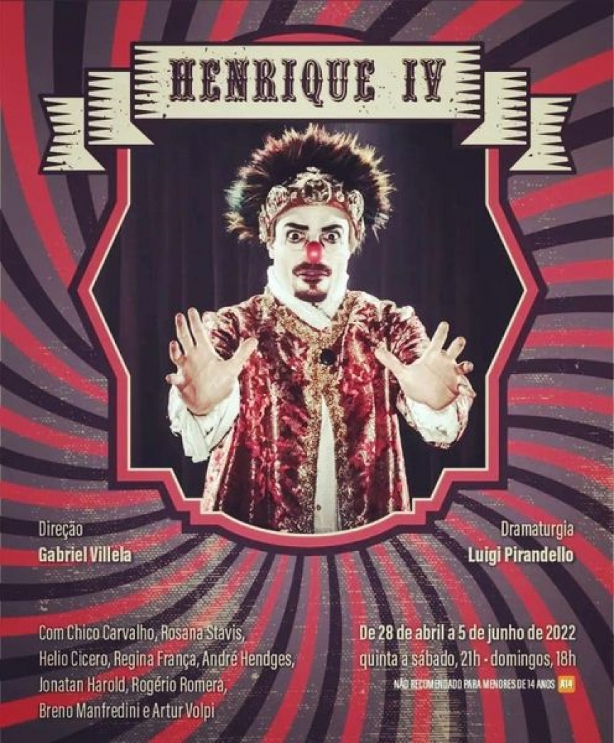 Sinopse curta: HENRIQUE IV é uma obra-prima do dramaturgo Luigi Pirandello. Aqui, Pirandello explora os limites entre a loucura e a lucidez a partir da estória de um homem que, após uma queda do cavalo e uma pancada na cabeça, vive (ou finge viver) o personagem que representava em uma festa de carnaval.