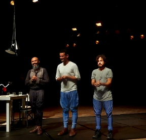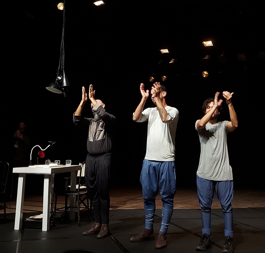 A encenação valoriza a palavra e a interpretação, com tom critico, com humor e uso de elementos como vídeo, filme e criação de uma história através de cinema artesanal.
