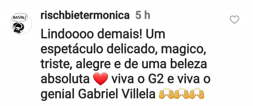 AL - Todos precisam assistir porque é a companhia master do Teatro Guaíra, a única companhia master do Brasil. Só por isso já vale a pena. Depois, a peça é de uma beleza imensa, de muita delicadeza e emoção. Tem a assinatura do Gabriel Villela e do G2 e por isso é imperdível.