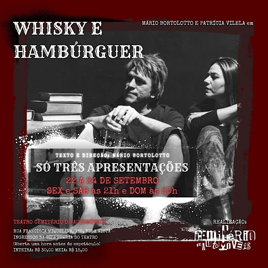 Sinopse: “Whisky e Hambúrguer” trata do que resta depois do fim de um relacionamento. O luto sentimental e o processo de desapego. Fala de um lugar que todos nós vivenciaremos, cedo ou tarde. Não há como impedir que as coisas saiam do lugar. Roberto foi abandonado pela esposa e está há uma semana bebendo whisky e comendo hambúrguer. Sua melhor amiga, Priscila, aparece para consolá-lo, mas as coisas nunca são exatamente como parecem.