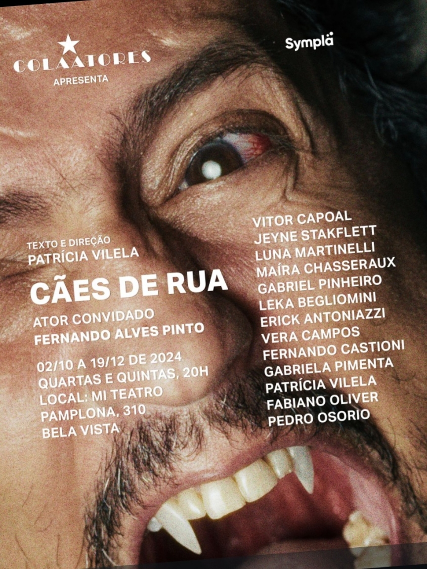 Cães de Rua, de Patrícia Vilela, é extremamente atual. Com produção da Cia Colaatores, com participação especial em off de Marcelo Tas, a peça traduz o caos dos nossos dias e a fragilidade num mundo em ebulição, individualista e mesquinho.