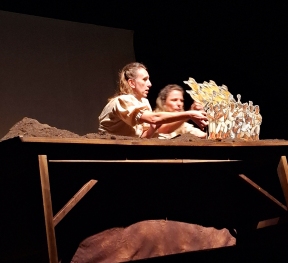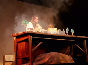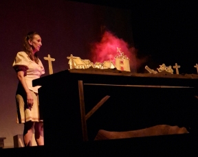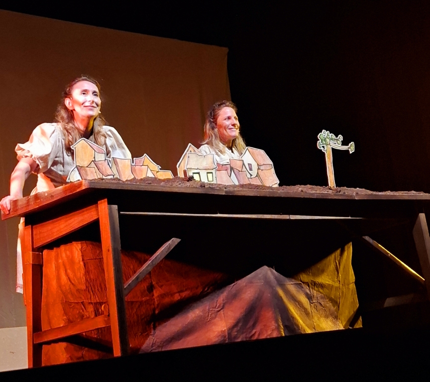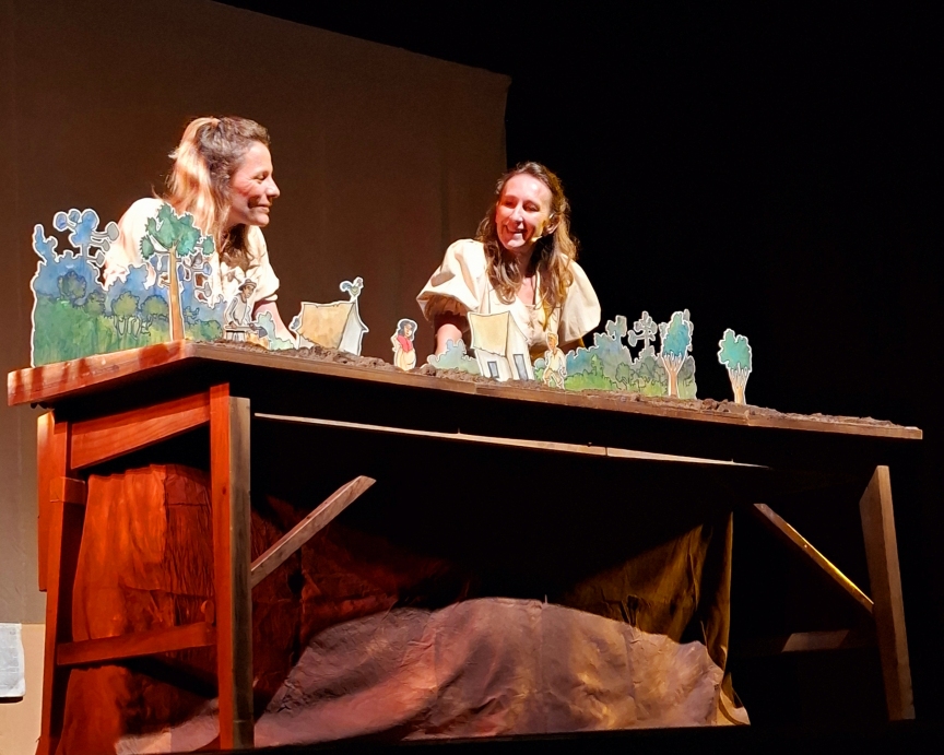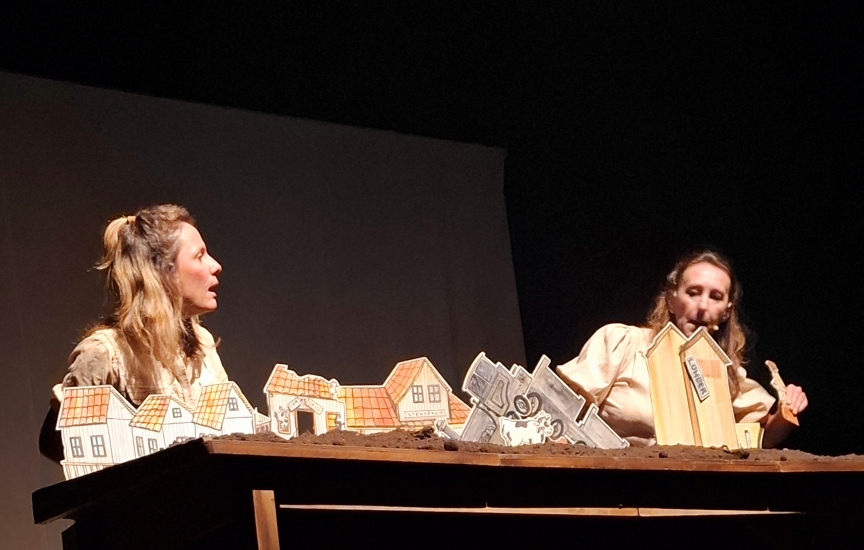 Mecanismos, figuras em madeira e pintadas à mão (casas, igrejas, florestas, caboclos e donos do poder (homens e mulheres) fogos e terra, tudo manipulado pelas atrizes, que também são narradoras, interpretam personagens e são contadoras da história.