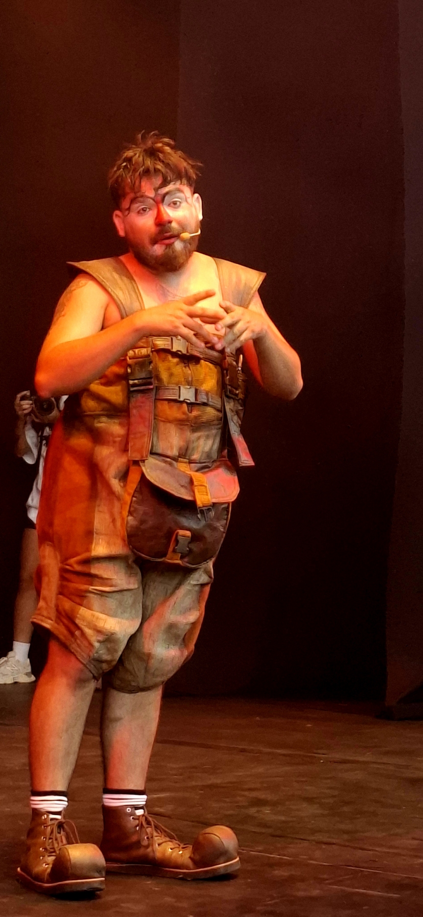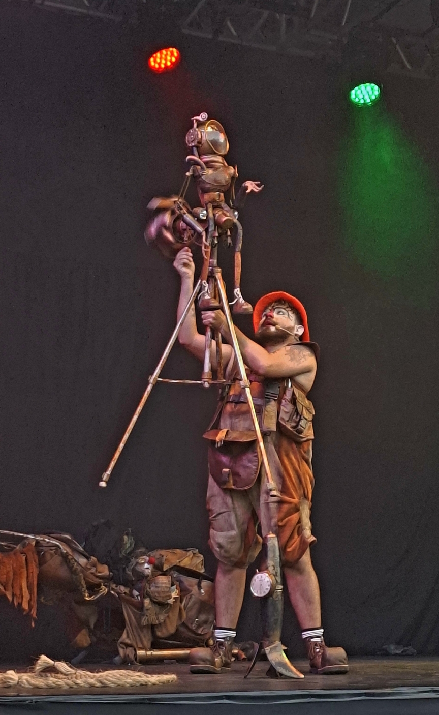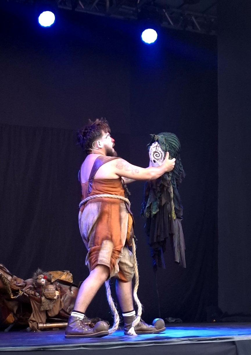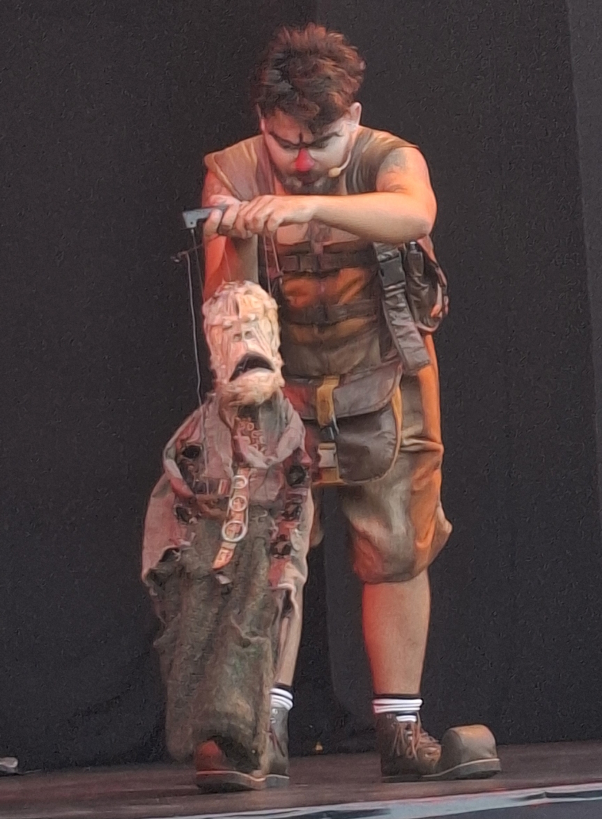 O teatro de animação e a música ajudam o palhaço a conversar com o público e explorar temas escabrosos como fome, pobreza, guerra, violência contra a mulher.
