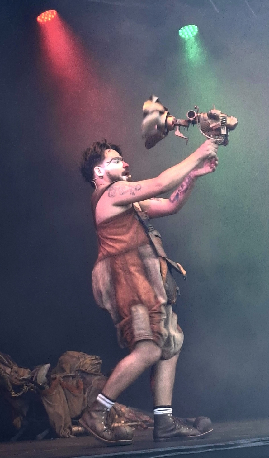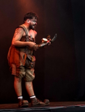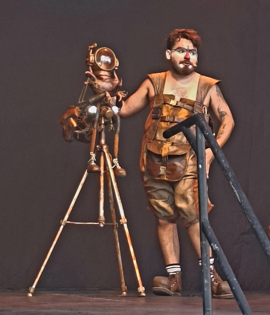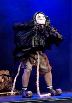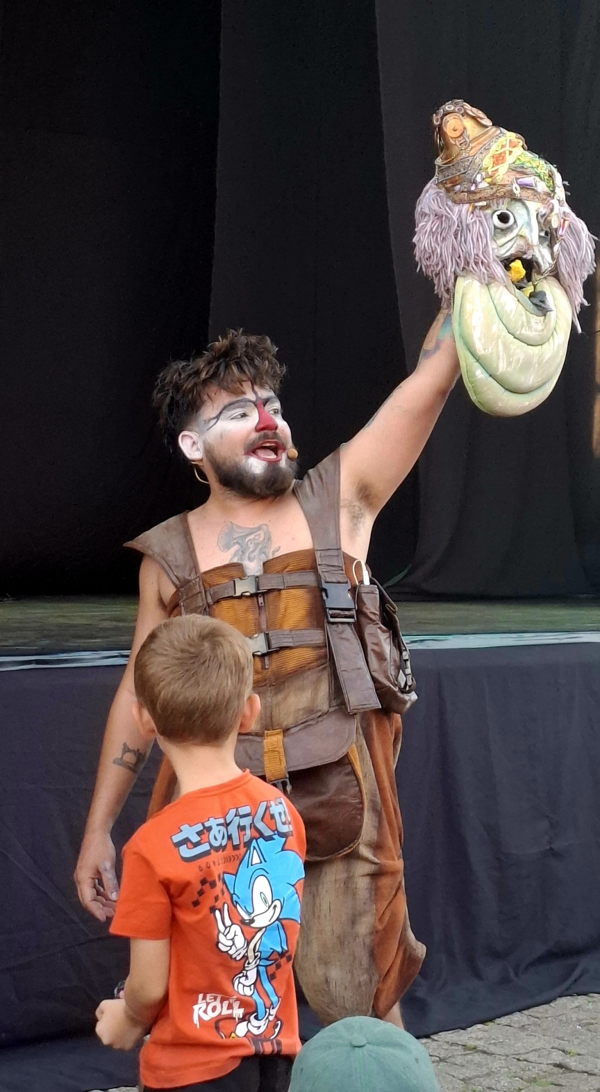 O teatro de animação e a música ajudam o palhaço a conversar com o público e explorar temas escabrosos como fome, pobreza, guerra, violência contra a mulher.