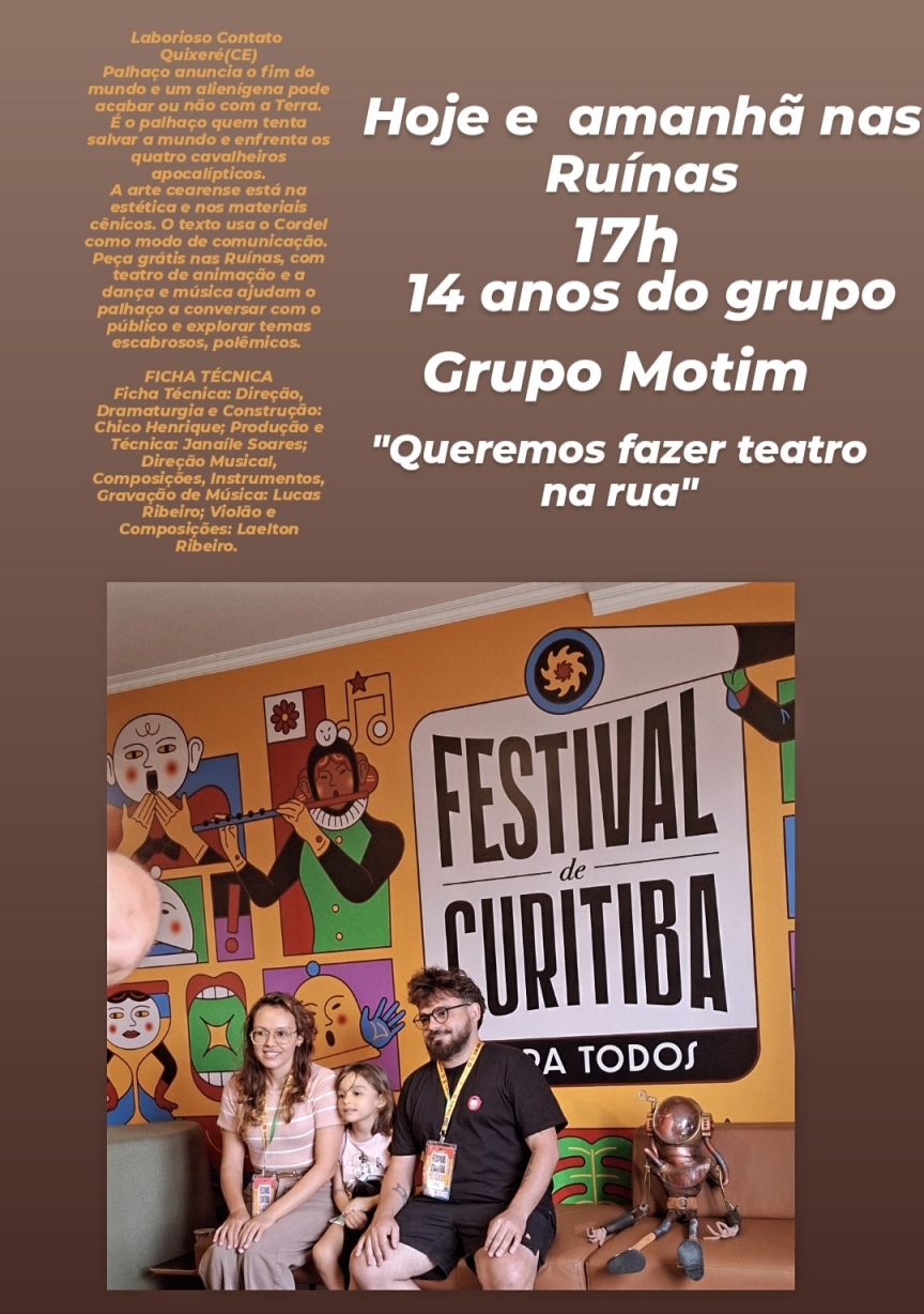Peça grátis nas Ruínas, com circo, bufão e animação... tudo que faz a alegria da gente.