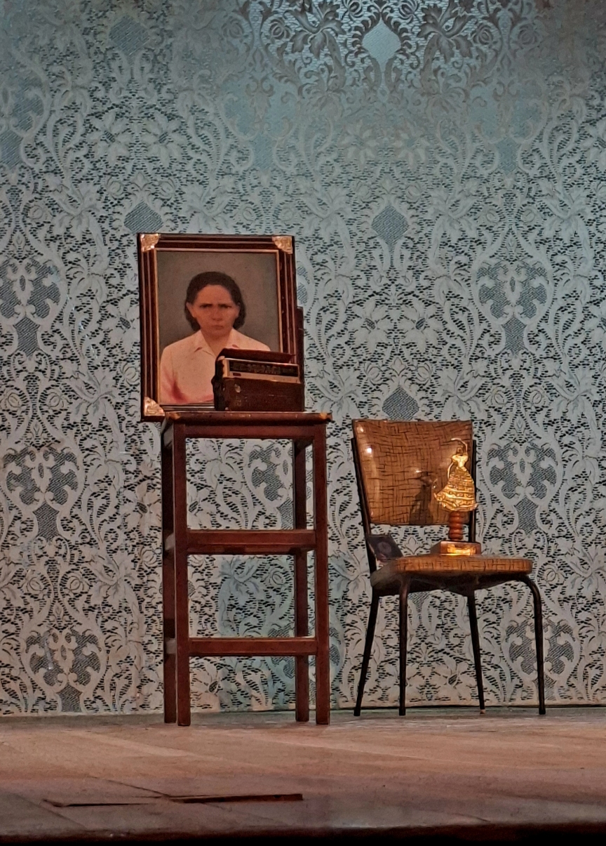 As lembranças são descortinadas num cenáro com uma cortina enorme bordada, igual a que existe em muitas residências antigas.