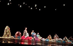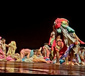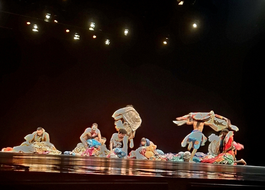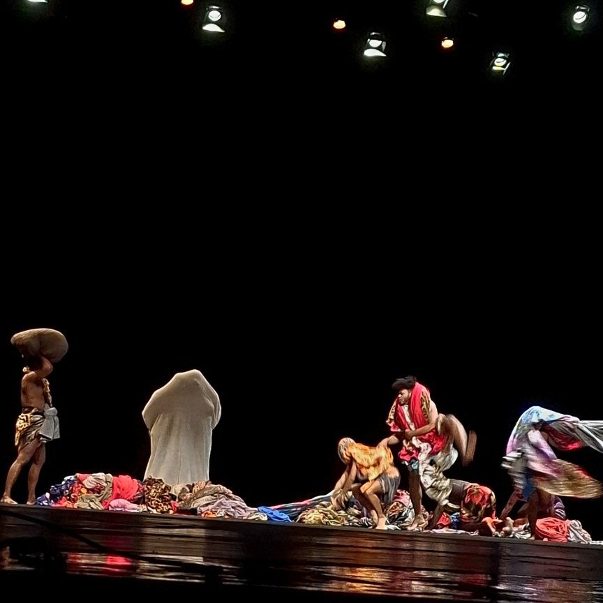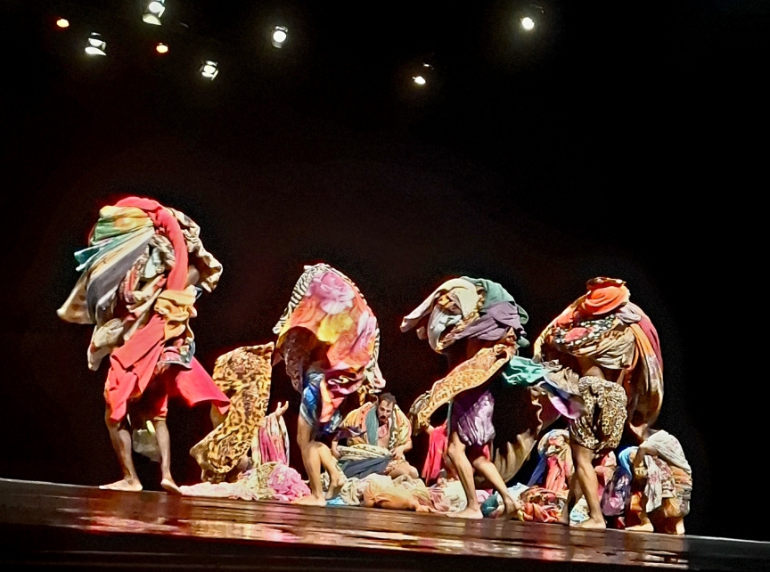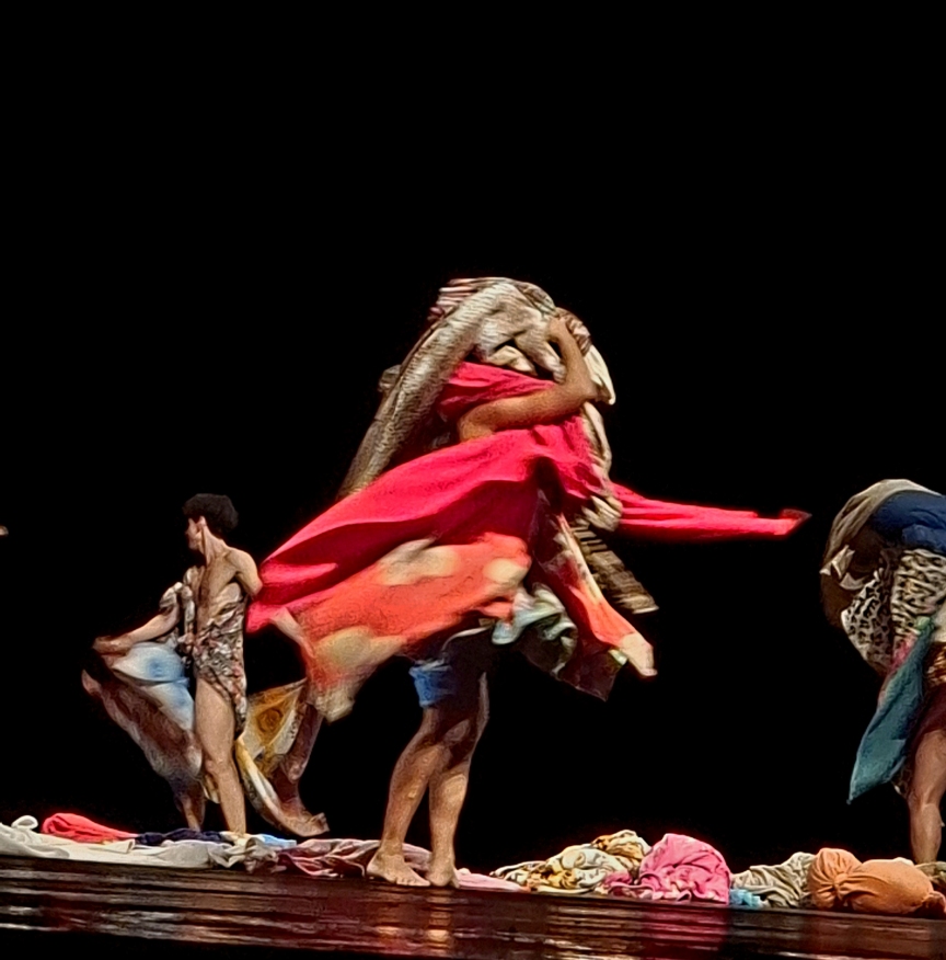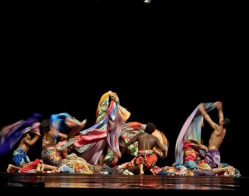 Interessante como os bailarinos usam cobertores, de diversas cores , estampas e tamanhos. São 140. Eles ganham diferentes funções cênicas e são parte dos corpos dos dançarinos. Se transformam em seres humanos, em seres meio bicho meio homem, negros, índios, senhores, Terra , mar, roupas dos ancestrais, dos orixais. Nascimento, vida, morte, outras possíveis vidas, os ciclos vitais.