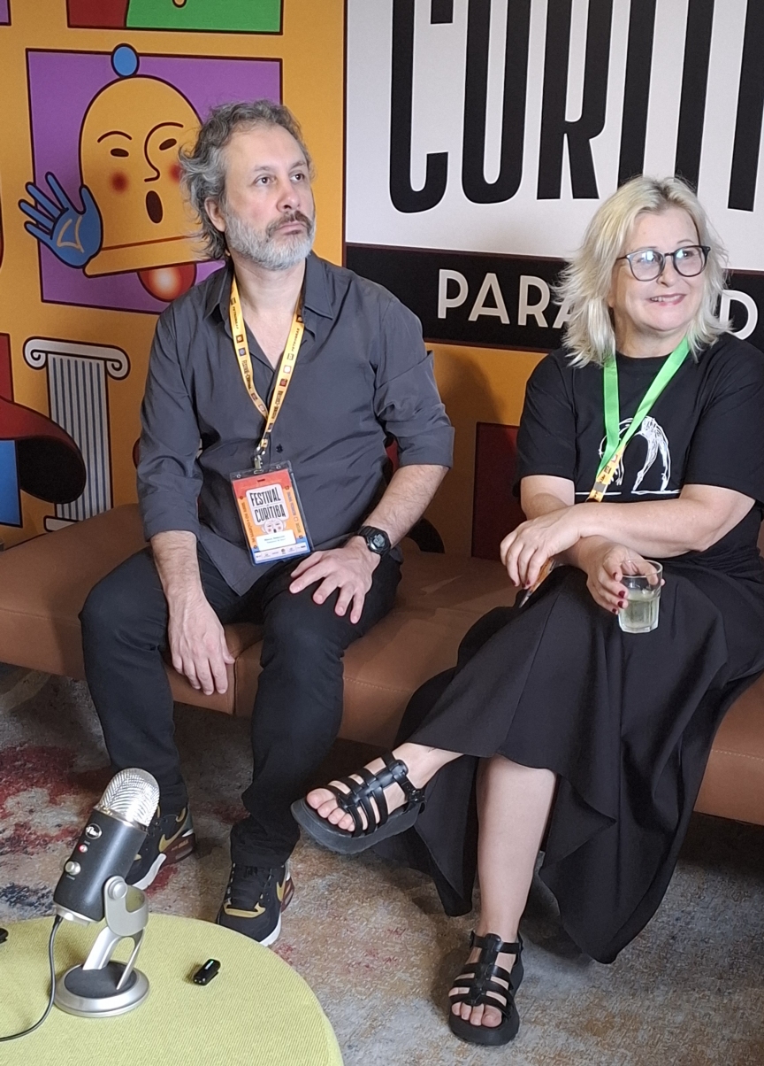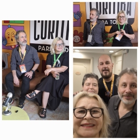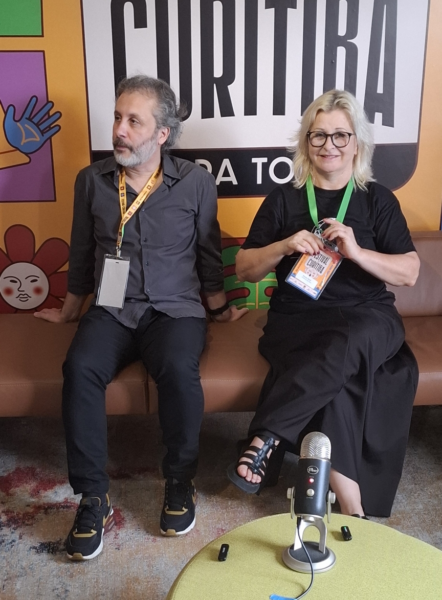 Na foto, a jornalista do site De Olho na Cena, Nanda Rovere, o diretor de Comunicação do Festival de Curitiba e assessor de imprensa da Cia, Maximilian Santos , Damaceno e Rosana.