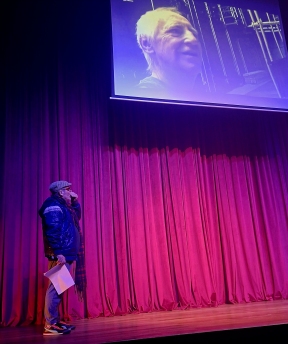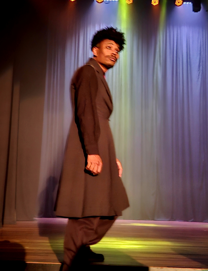 as suas criações sào importantes para o teatro. Ele lê um manifesto do autor da peça Renan Queiroz e ao fundo, um vídeo do mestre Zé, ao piano, ilumina o palco.