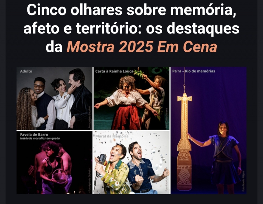 Mostra 2025 Em Cena traz cinco olhares sobre memória, afeto e território Os espetáculos Adulto, Carta à Rainha Louca, Mural da memória, Favela de Barro e o infantil Pa’ra – Rio de memórias são os destaques da Mostra 2025 Em Cena