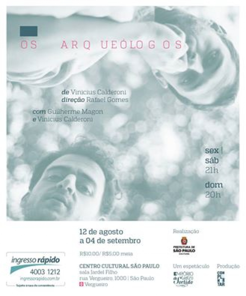 OS ARQUEÓLOGOS – Reestreia em 25 de outubro, terça-feira, às 21 horas, na Sala Viga do Viga Espaço Cênico. Texto – Vinicius Calderoni. Direção – Rafael Gomes. Elenco – Guilherme Magon e Vinicius Calderoni. Iluminação e Cenografia – Marisa Bentivegna. Figurino – Daniel Infantini. Direção de Produção – César Ramos. Produtor – Gustavo Sanna. Produção – Empório de Teatro Sortido e Complementar Produções. Duração – 60 minutos. Recomendado para maiores de 10 anos. Ingressos – R$ 40,00 e R$ 20,00 (meia-entrada). Temporada – Até 30 de novembro, terça e quarta-feira às 21 horas.