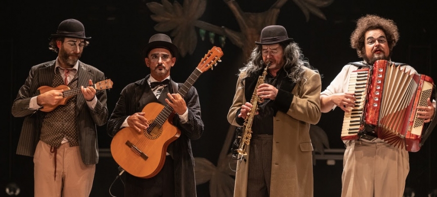 o elenco, Celso Frateschi, Danilo Grangheia, Dagoberto Feliz e Demian Pinto, que faz a trilha ao vivo no espetáculo.