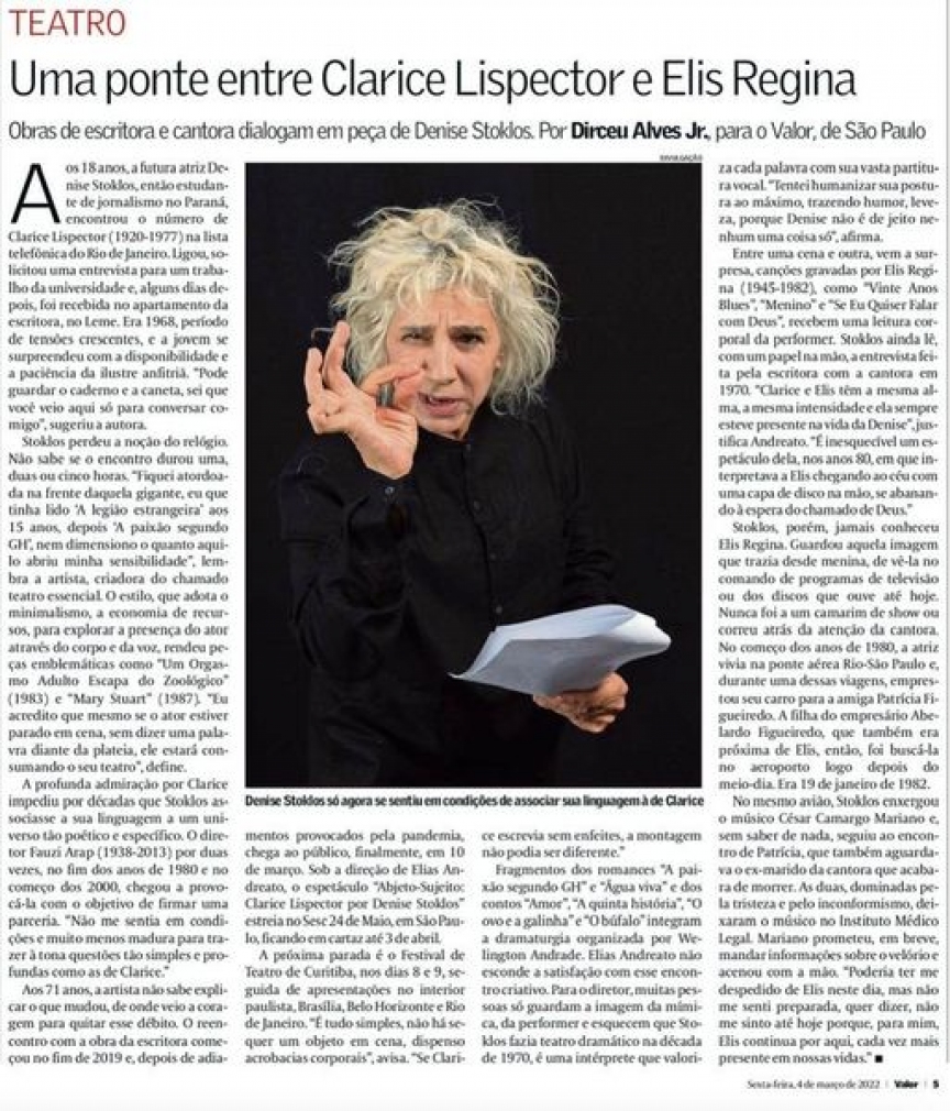 Muitos anos após declinar o convite do diretor Fauzi Arap (1938-2013) para criar um espetáculo com textos de Clarice Lispector, a atriz e diretora Denise Stoklos promove o encontro do teatro essencial com a obra clariciana. O resultado é uma investigação radical a respeito de como o corpo, a voz e a emoção da intérprete expressam uma palavra literária empenhada em dizer o que a todo momento beira o indizível. Canções de Elis Regina pontuam de tempos em tempos o percurso que vai da negação à constituição do sujeito.