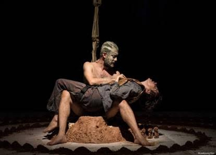 Donizeti Mazonas explica que a peça já começa com as personagens no limite da ação. “Não há desenvolvimento de enredo, o auge já está lá, no início. A encenação ocorre em dois planos, um vertical onde está Koyo-Homem, preso a um pau-de-sebo (tranças douradas) e outro horizontal, onde está Haydum-Deus, no chão em meio a uma espiral feita com terra (palmas de mãos postas enfileiradas).