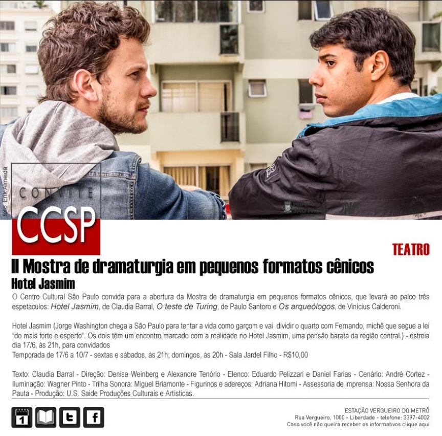 MOSTRA DE DRAMATURGIA EM PEQUENOS FORMATOS CÊNICOS DO CENTRO CULTURAL SÃO PAULO apresenta HOTEL JASMIN - Estreia em 17 de junho, sexta, às 21 horas, na Sala Jardel Filho. Dramaturgia – Claudia Barral. Direção – Denise Weinberg e Alexandre Tenório. Elenco – Eduardo Pelizzari e Daniel Farias. Cenografia – Andre Cortez. Trilha Sonora – Miguel Briamonte. Designer de luz – Wagner Pinto. Produção – U.S. Saide Produções Culturais e Artísticas. Gênero – Drama. Recomendação etária – 14 anos. Duração – 70 minutos. Temporada – Até 10 de julho. Sexta-feira e sábado às 21 horas e domingo às 20 horas. Realização – Centro Cultural São Paulo.