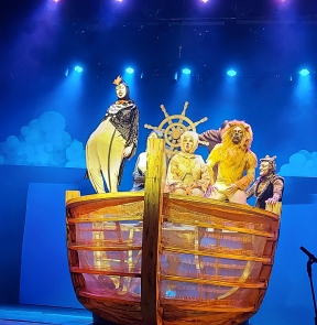 No centro do palco uma grande arca, onde os bichos entram e saem para que as cenas prendam a atenção da criançada. E os pequenos ficam vidrados!