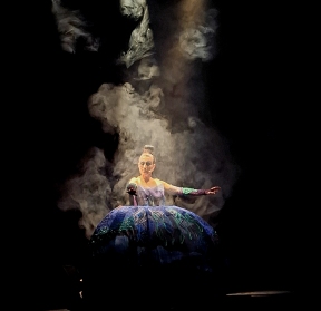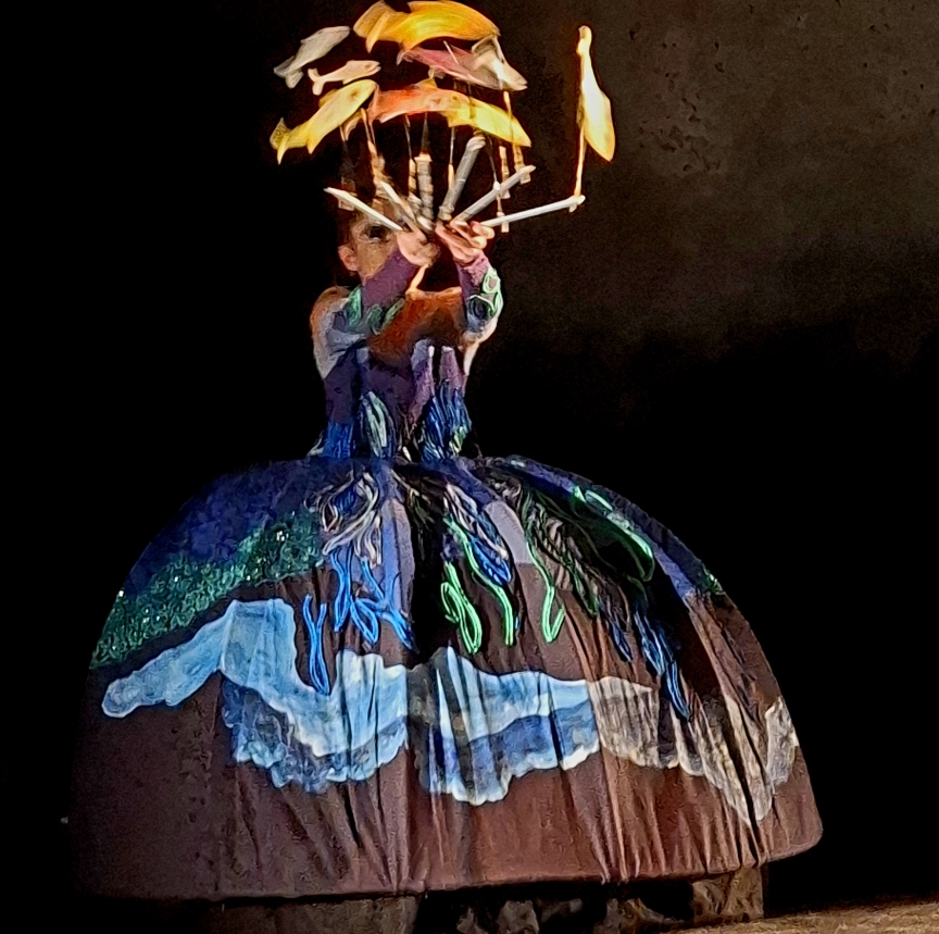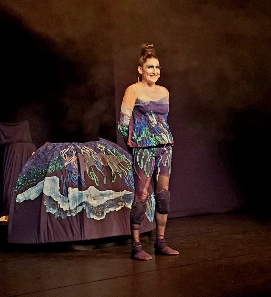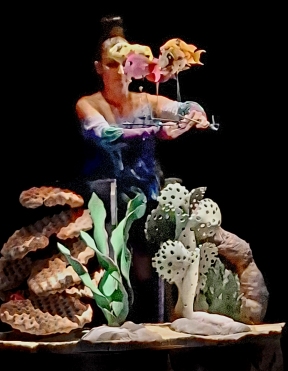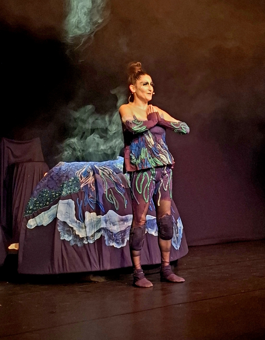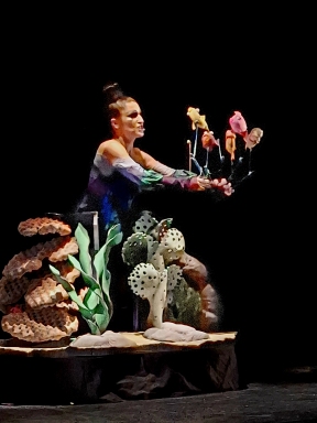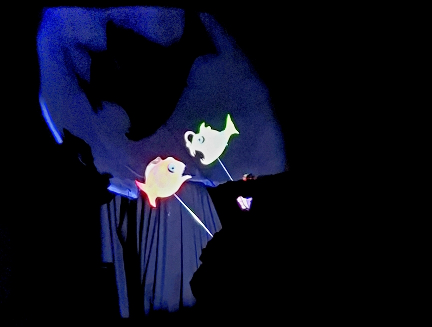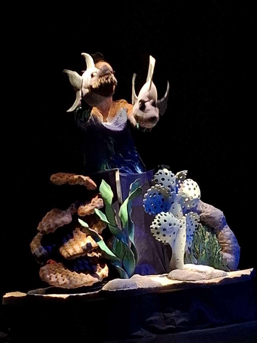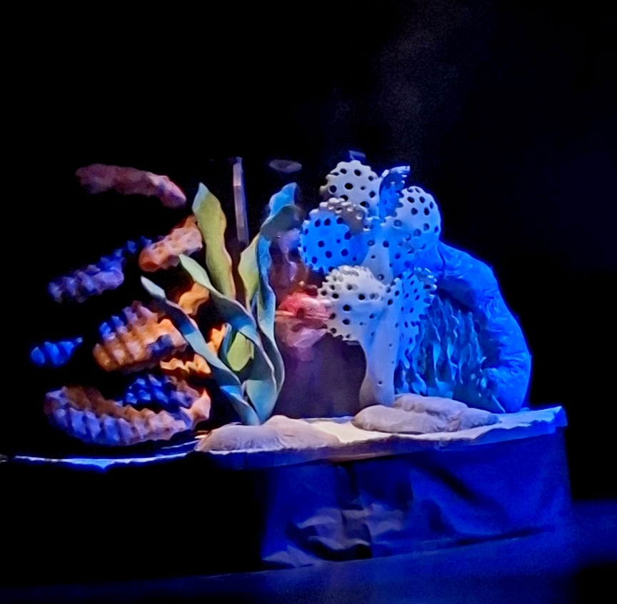 A atriz, manipuladora, é uma fada, ou seria uma sereia, que veste um vestido de gala com detalhes em azul e branco e que tem uma saia ilustrada com elementos marinhos. Ela mergulha no mar imaginário e os peixes e tubarões" saltam" desse vestido. Com pouco texto verbal são as imagens, luzes, músicas, sons e movimentos que contam a história.