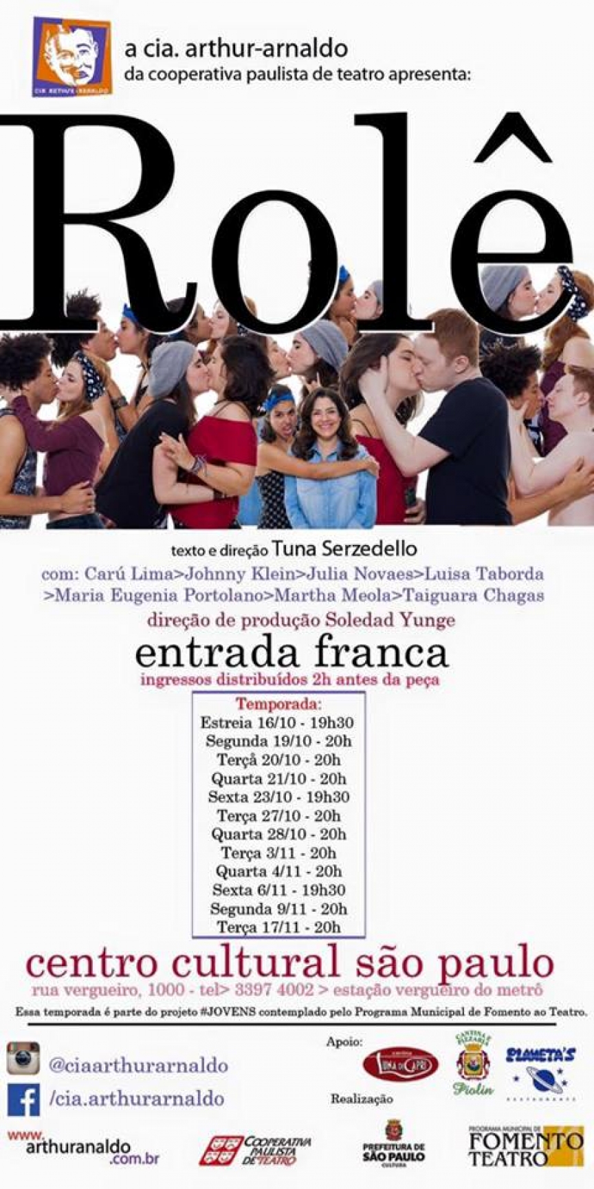 Ficha Técnica – Rolê Autor: Tuna Serzedello Elenco: Carú Lima, Johnny Klein, Julia Novaes, Luisa Taborda, Maria Eugenia Portolano, Martha Meola e Taiguara Chagas. Cenografia: Rafael Souza Figurinos: Soledad Yunge Iluminação: Rafael Souza Trilha Sonora Original: Maestro Marcello Amalfi Fotos: Edson Kumasaka Direção de Produção: Soledad Yunge Direção: Tuna Serzedello Realização: Cia. Arthur-Arnaldo da Cooperativa Paulista de Teatro Essa temporada é parte do projeto #JOVENS contemplado pela 26a edição do programa municipal de teatro para a cidade de São Paulo. Crédito das fotos: Edson Kumasaka