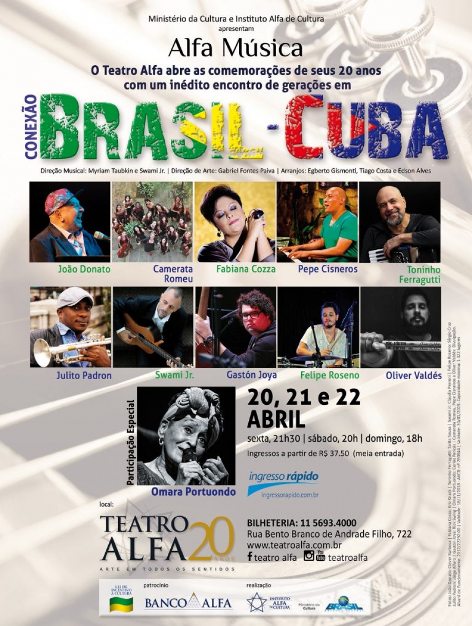 Nos dias 20, 21 E 22 DE ABRIL, os admiradores da música latina terão a oportunidade de ver no palco do teatro Alfa o encontro entre os brasileiros João Donato, Fabiana Cozza,,Toninho Ferragutti, Swami Jr e Felipe Roseno, que farão combinações inéditas com os cubanos Omara Portuondo (única mulher a integrar o grupo original do projeto Buena Vista Social Club), Pepe Cisneiros, Julito Padrón, Camerata Romeu (primeira orquestra de cordas feminina da América Latina), Gastón Joya e Oliver Valdés.