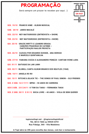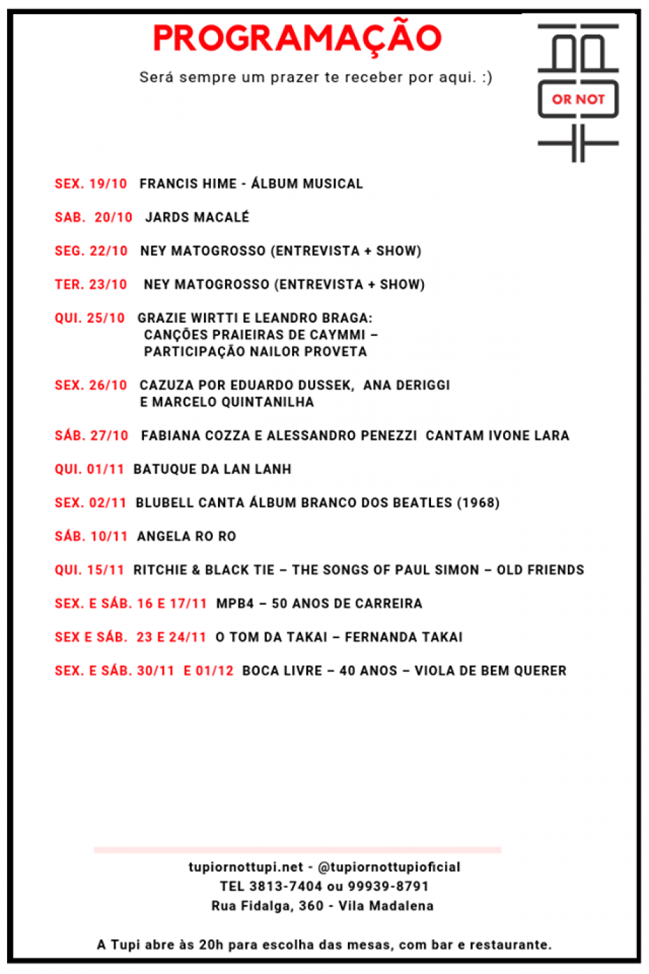 A TUPI abrirá excepcionalmente às 19h para a escolha das mesas, com serviço de bar e restaurante. A entrevista terá início às 21h. Não está incluído o serviço de bar e restaurante no valor do ingresso.