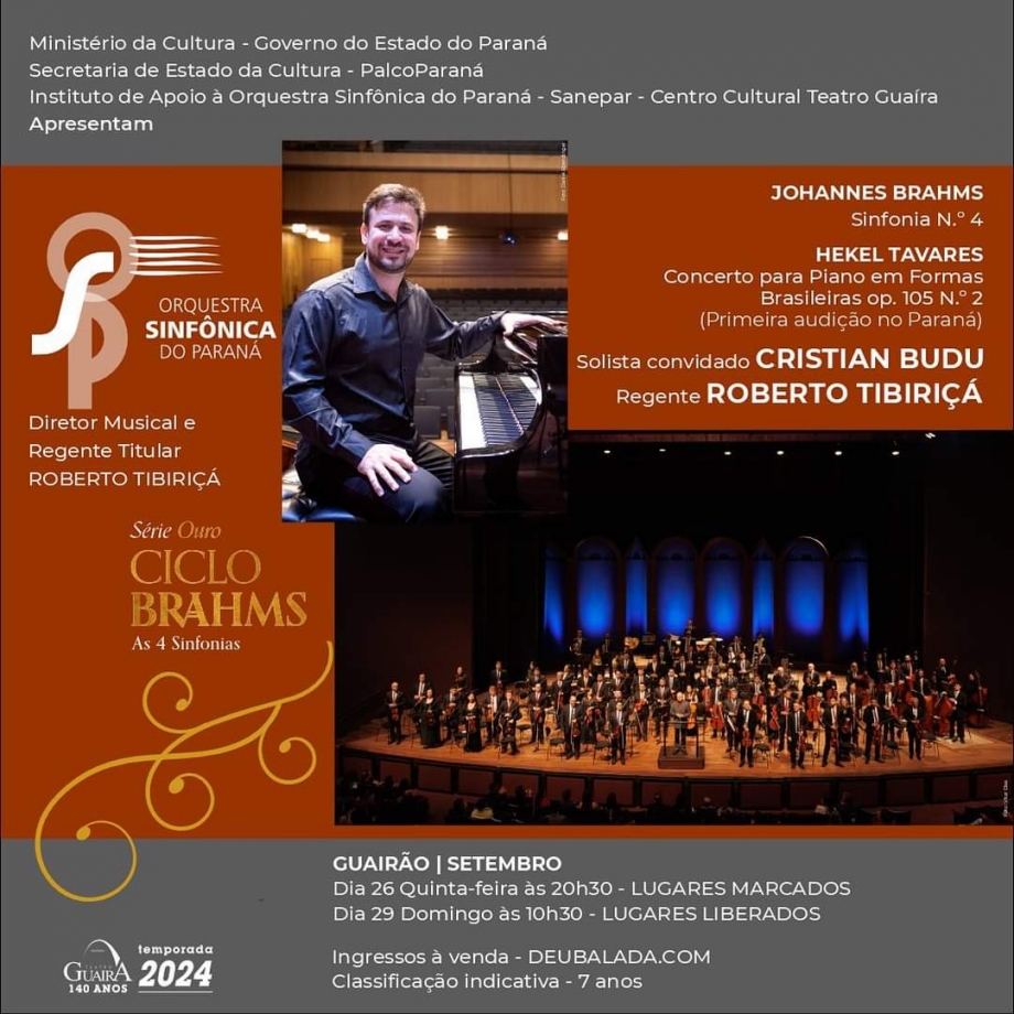 A Orquestra Sinfônica do Paraná completa a Série Ouro: “Ciclo das 4 Sinfonias de Brahms”, primeiro ato, unindo a quarta sinfonia do compositor alemão à obra romântica do brasileiro Hekel Tavares, segundo ato.