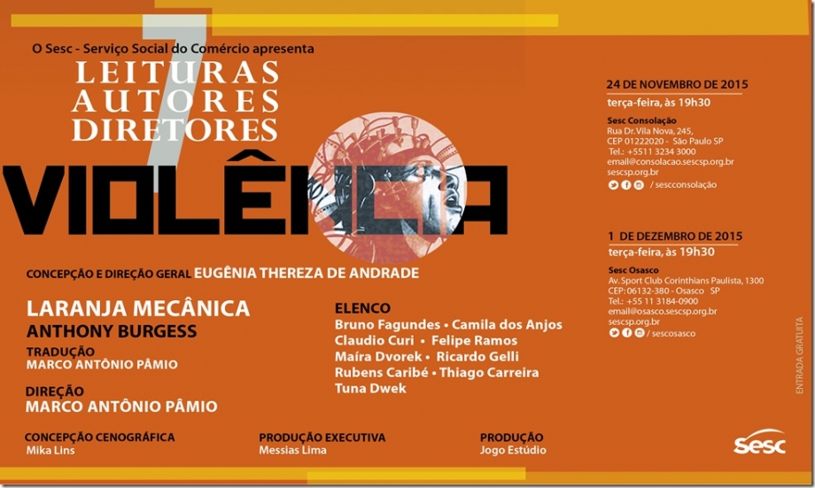O ciclo de Leituras 7 Leituras, 7 Autores, 7 Diretores dedicado à violência termina com a leitura encenada do texto Laranja Mecânica, de Anthony Burgess. Marco Antônio Pâmio assina a direção.