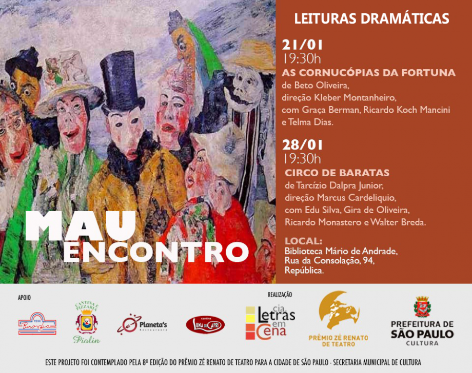 As leituras encenadas dos textos As Cornucópias da Fortuna e Circo de Baratas têm entrada gratuita e o evento foi contemplado na oitava edição do Prêmio Zé Renato de Teatro para a Cidade de São Paulo.