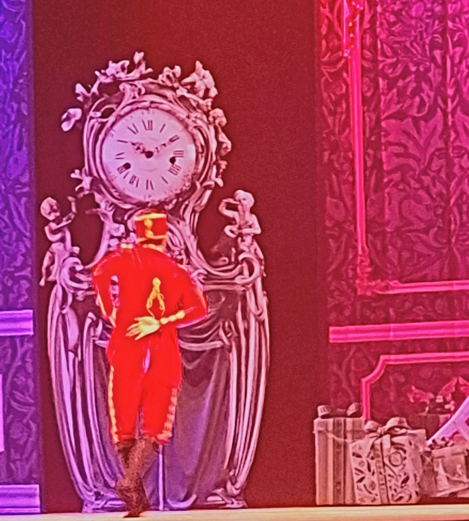 As cores vermelho e branco são predominantes, o vermelho do quebra-nozes e o branco da jovem menina Clara.