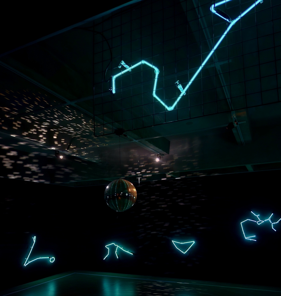 O silêncio também tem lugar na exposição, que traz aos visitantes um local especial, que nos remete às discotecas, e nos conecta com o espaço celeste.
